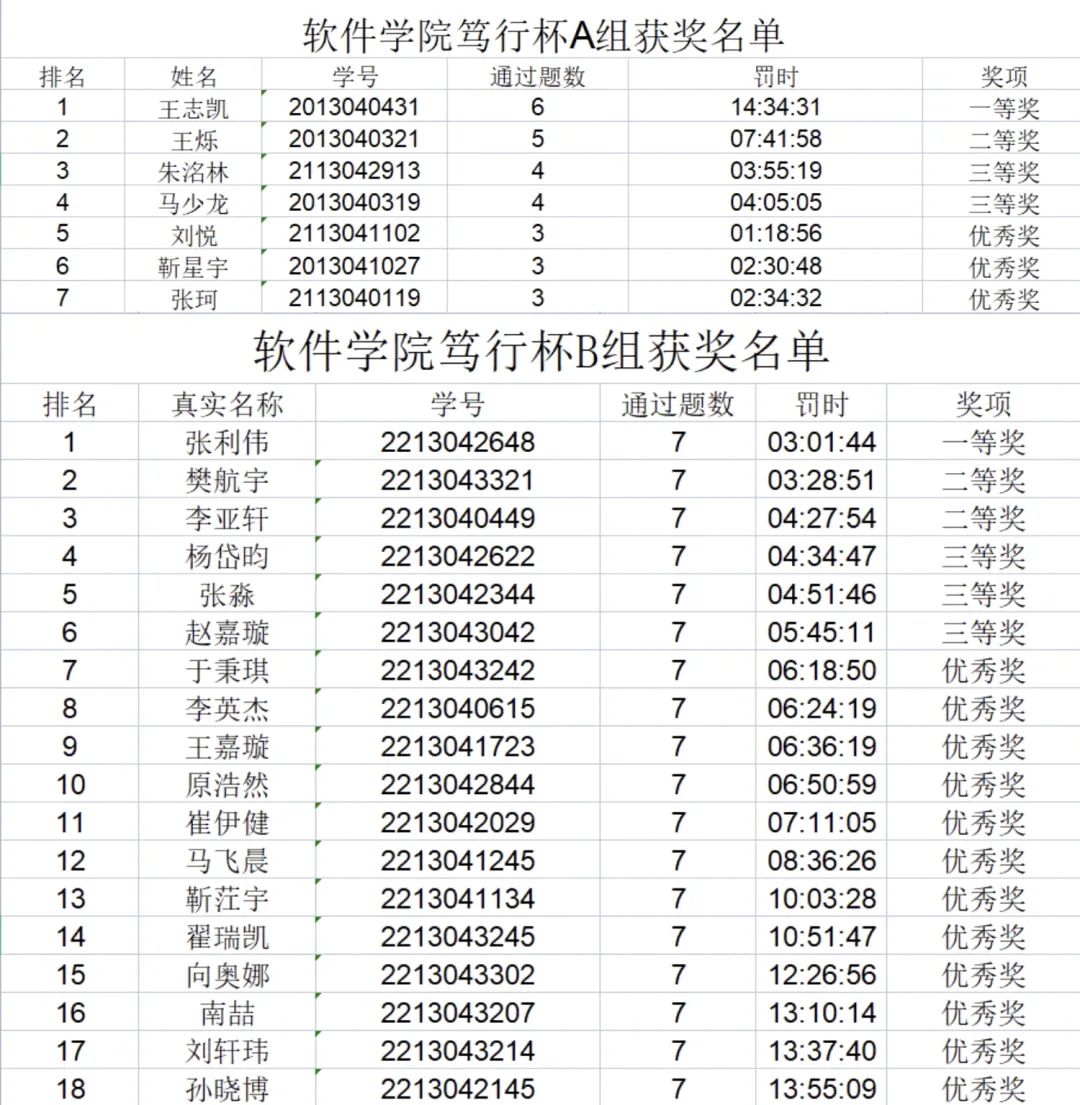比赛面向我院全体本科生,共有257名同学参赛。考虑不同年级学生之间专业能力的差异,比赛分A、B两组进行,A组参赛选手为大二、大三、大四学生,B组参赛选手是大一新生。比赛依托牛客平台,采用ACM赛制,以个人形式参赛。比赛设置7道编程题,对所用编程语言不做限制,通过题数越多排名越靠前,通过题数相同的情况下按照答题时间+罚时进行排名。在比赛过程中,为确保比赛的公平公正,工作人员全程线上监考,参赛选手们聚精会神、思考专注、创意新颖,双手轻快的敲击着键盘,熟练的操作着编程软件,经过3个小时的激烈角逐后,最终共有25名同学获得比赛名次和奖项。