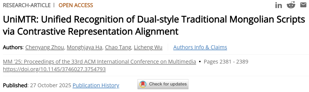 为第一单位,联合内蒙古大学、中央民族大学在多媒体与人工智能领域顶级国际会议ACM Multimedia 2025(简称 ACM MM 2025)发表科技论文《UniMTR: Unified Recognition of Dual-style Traditional Mongolian Scripts via Contrastive Representation Alignment》。ACM Multimedia是由Association for Computing Machinery主办的国际顶级会议,被中国计算机学会(CCF)列为A类会议,是多媒体领域最具影响力的旗舰会议之一。